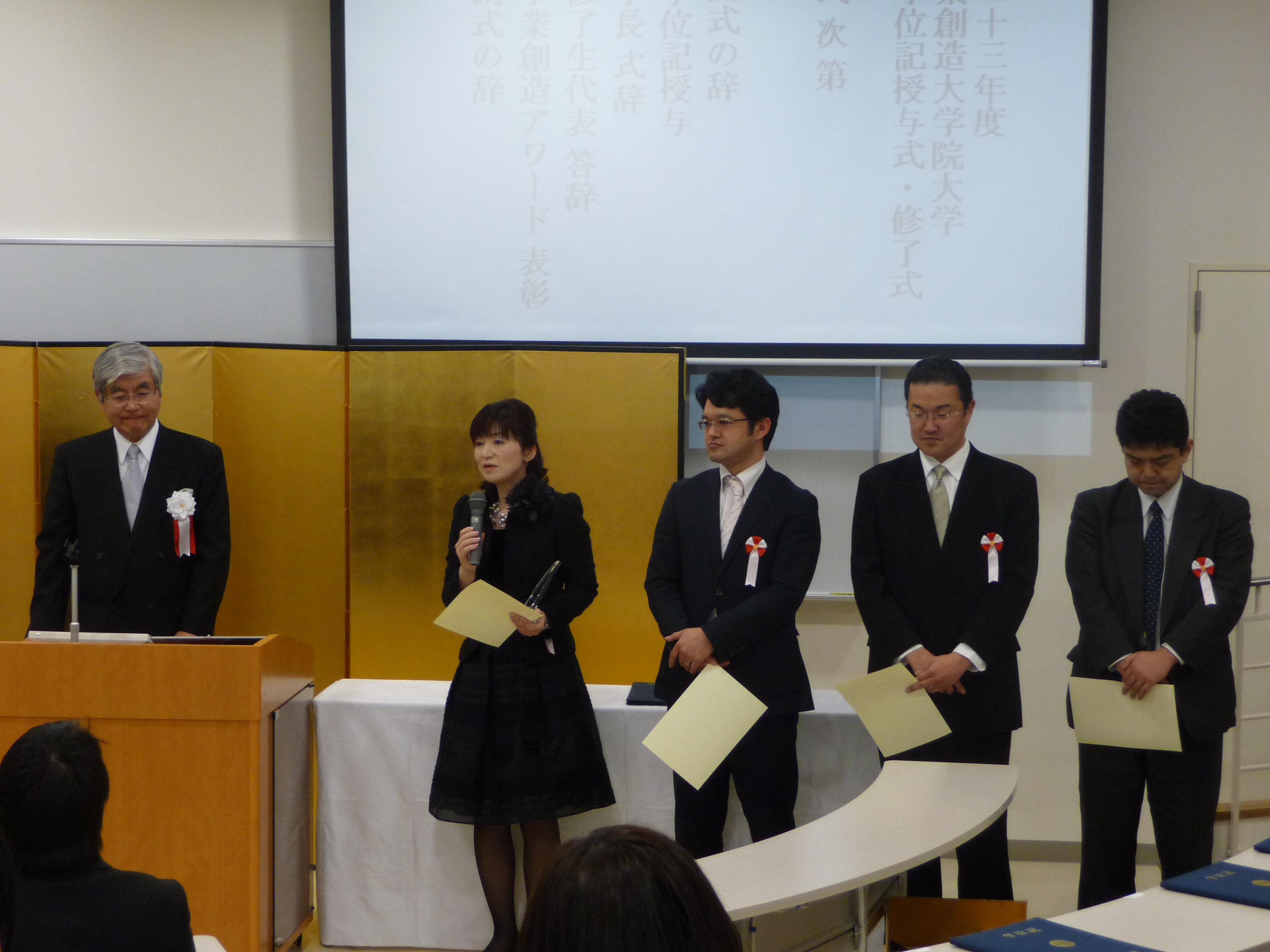 また学位記授与式終了後には、本大学院の修了要件でもある事業計画書について、優秀な事業計画書を表彰する「事業創造アワード」が行われました。
