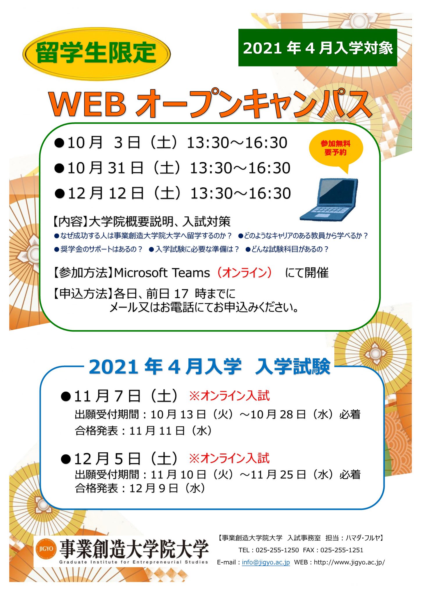 2020年10月3日(土)に留学生の方を対象とした『WEBオープンキャンパス』を開催致します。今回はオンラインで大学院概要説明や過去の入試問題を紹介し、入試・面接徹底対策を実施します。